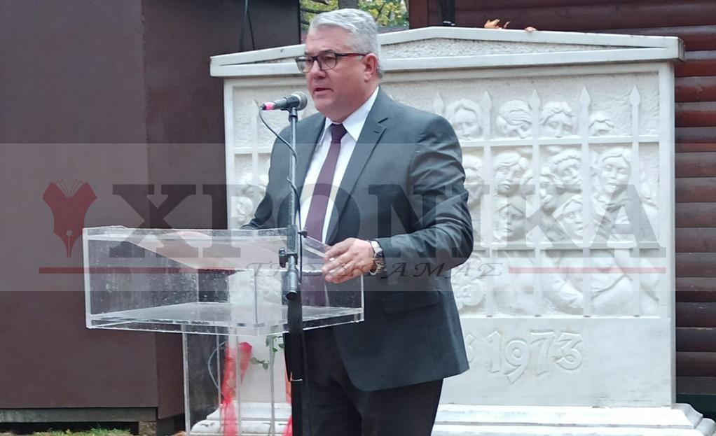 Ο Αντιπεριφερειάρχης Δράμας, κ. Γρηγόρης Παπαεμμανουήλ, τόνισε ότι κάθε 17η Νοέμβρη η σκέψη όλων γυρίζει στην Αθήνα και στο Πολυτεχνείο του 1973 και η καρδιά χτυπάει μαζί με τις καρδιές των ελεύθερων αγωνιζόμενων φοιτητών, των ελεύθερων αγωνιζόμενων Ελλήνων, αυτών που ξεσηκώθηκαν και η εξέγερσή τους υπήρξε καταλυτική για την αποκατάσταση της δημοκρατίας, έβγαλε τον ελληνικό λαό στους δρόμους και όρθωσε το ανάστημά του απέναντι στους δικτάτορες.